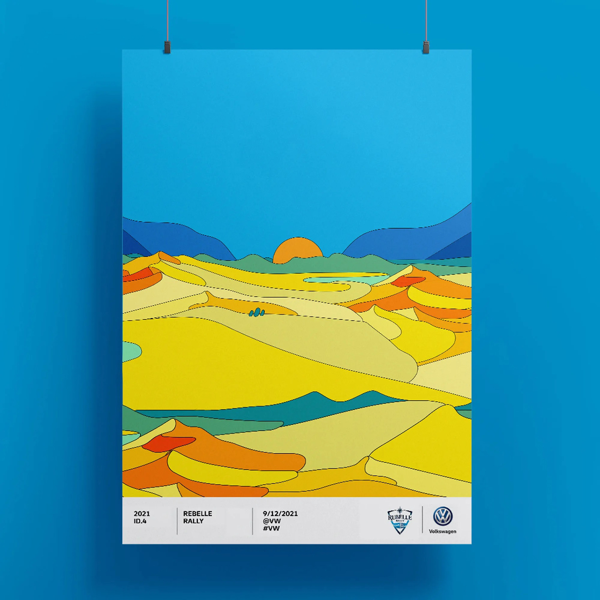 Design challenges. With over 8 days of competition it is a demanding on the car and the team let alone the custom graphic wrap I created. The illustration colors were intentionally designed with the hot desert sun in mind, so no black or dark colors were used. This would keep the electric ID.4 car cool to reduce any excessive battery drain that might happen. Each logo was thoughtfully placed and scaled to be visible for drone footage above to low angle photos from below.